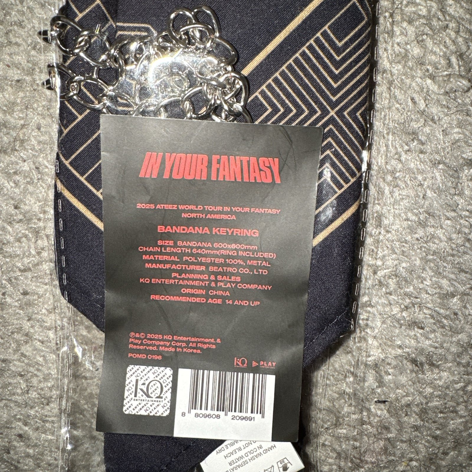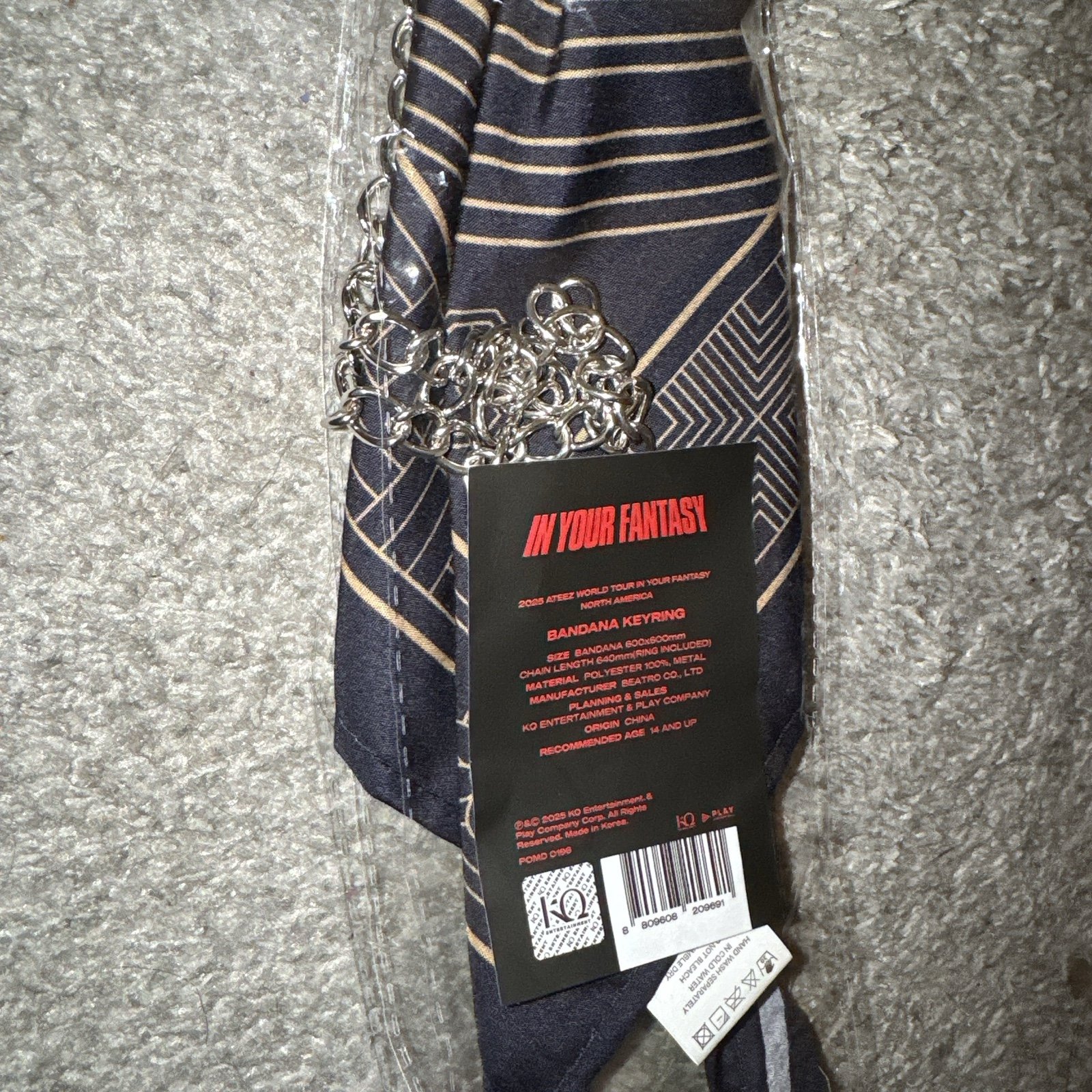 Official ATEEZ In Your Fantasy World Tour 2025 Bandana Keyring Keychain. Brand new, never used. Sides of plastic packaging are open.