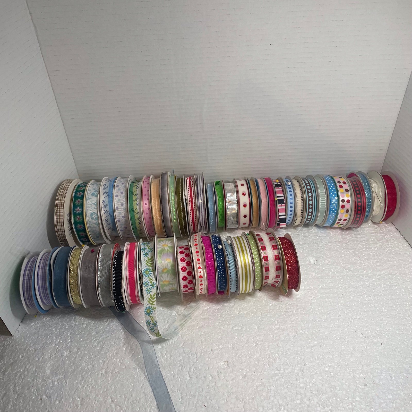 Lot of 50 preowned ribbons. Different sizes including 3/8, 1/2, 1/4,5/8, all with varying amount of ribbon left. Most have a large majority left. A couple are unopened. Flower patterns, glitter, dots, stripes, hearts, dragon flies and mesh. These are vintage. Polyester and nylon. Pinks,reds,blues,greens,black,white,silver,gold, and purple. See photos