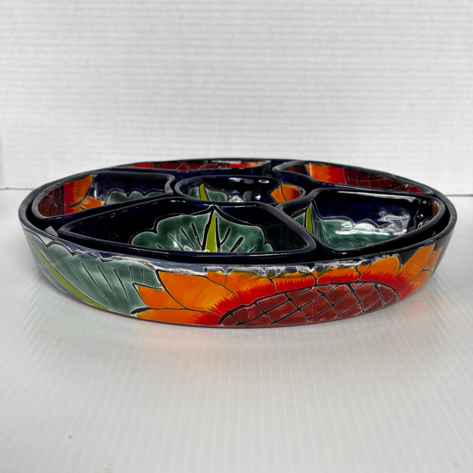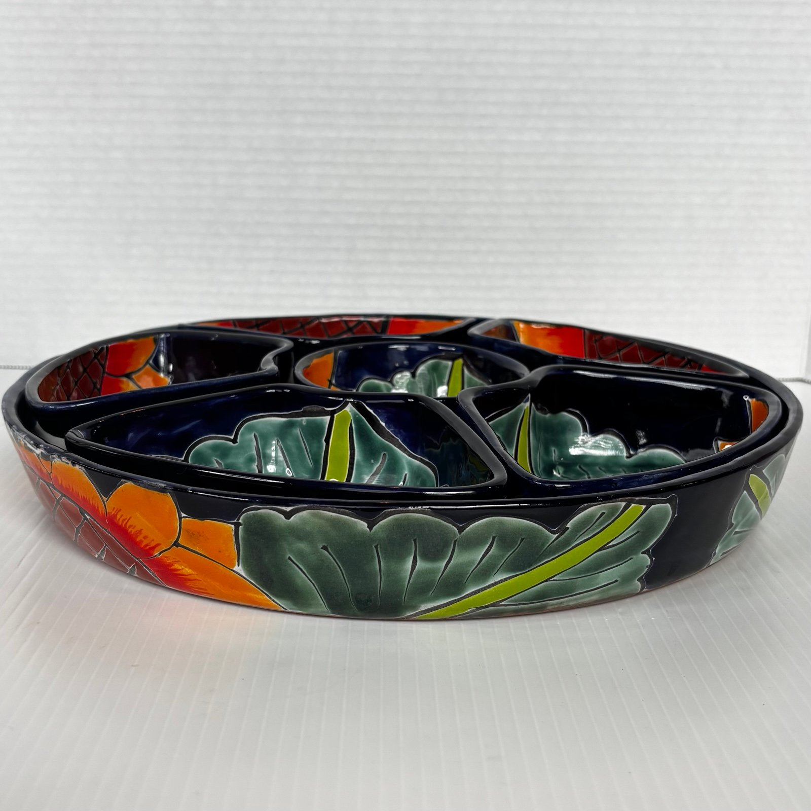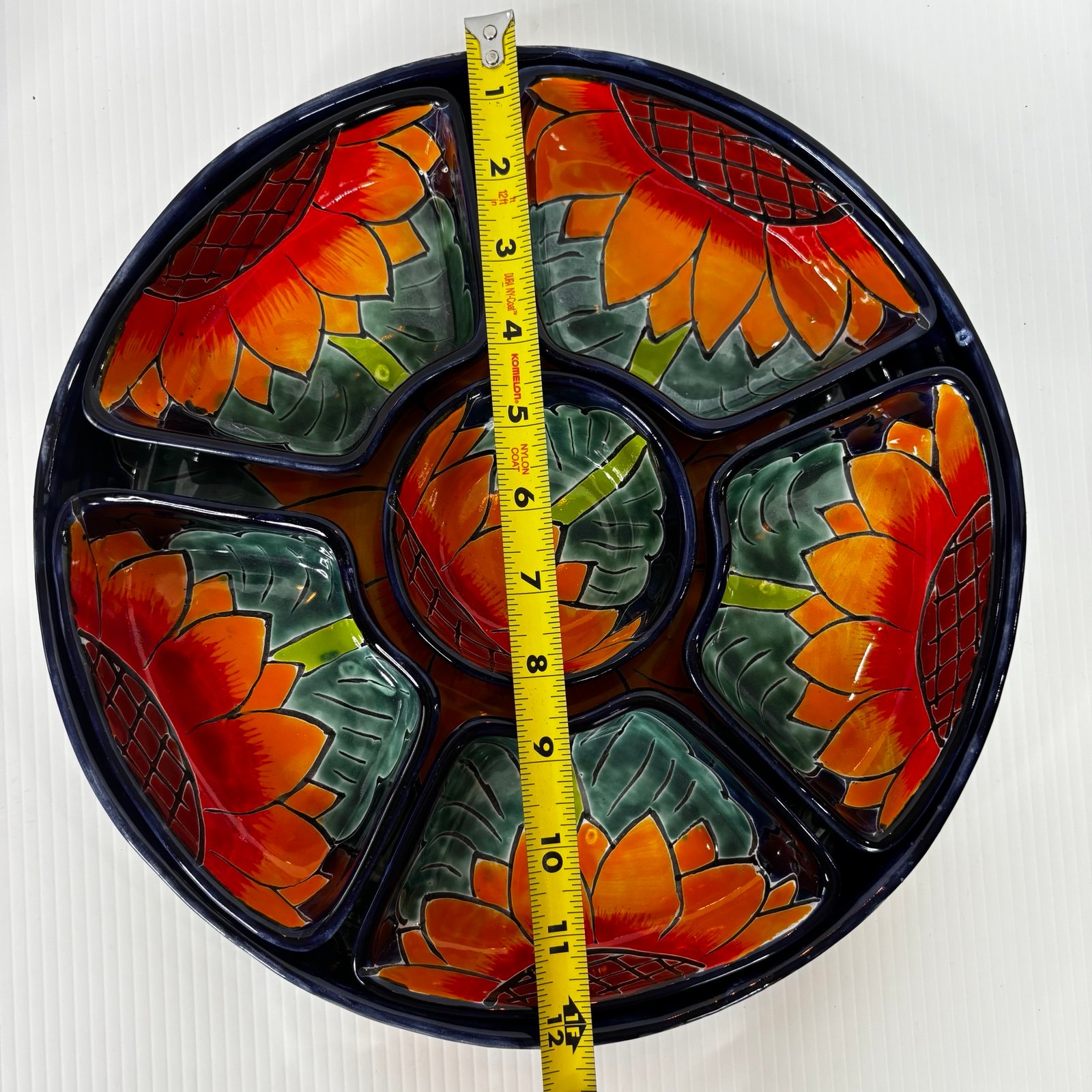 Talavera Floral Chip Dip Salsa Taco Serving Dish Mexican Pottery Tray Lead Free. Beautiful serving dish with 6 separate serving dishes that fit inside a larger platter. Lots of different ways to use this set to serve your different appetizers and dips. Beautiful pre-owned condition, no chips or cracks. Measures approximately 12x12x2. Heavy piece, weight for shipping will be 8lbs.