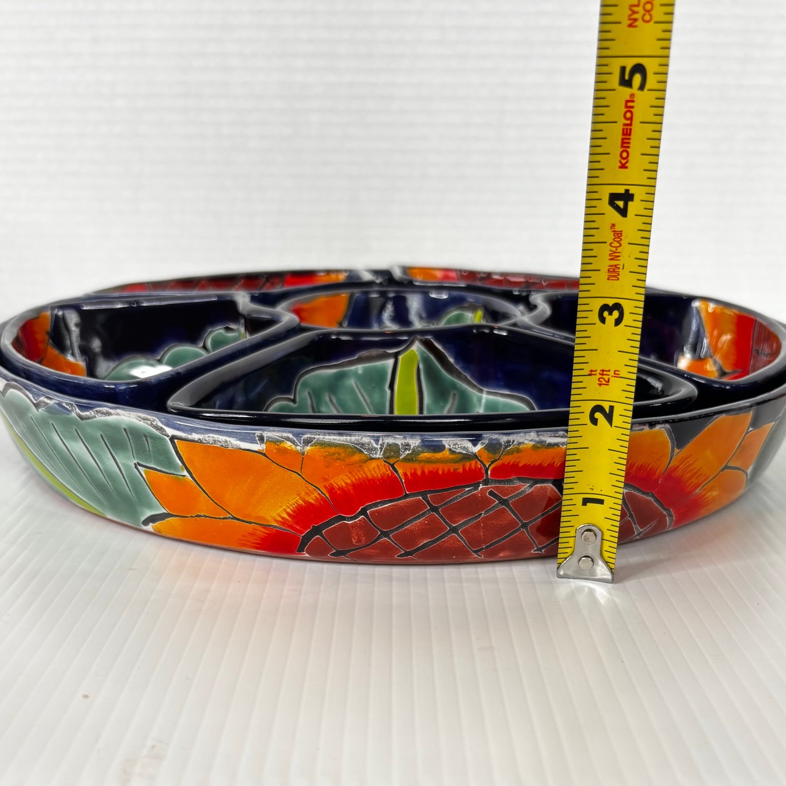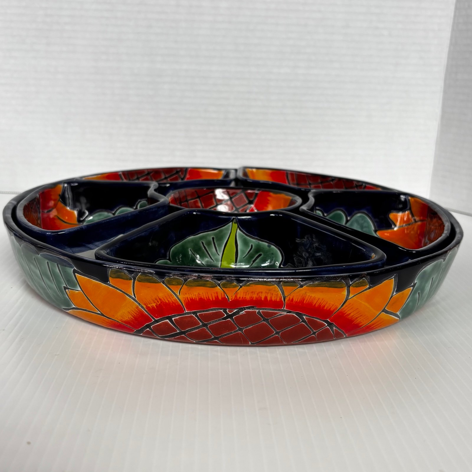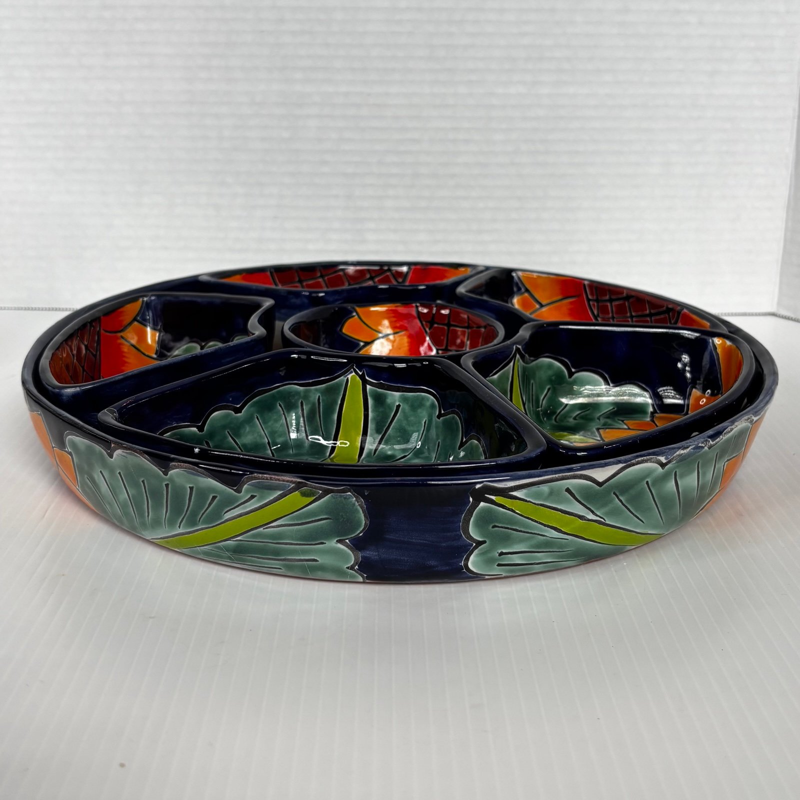 Talavera Floral Chip Dip Salsa Taco Serving Dish Mexican Pottery Tray Lead Free. Beautiful serving dish with 6 separate serving dishes that fit inside a larger platter. Lots of different ways to use this set to serve your different appetizers and dips. Beautiful pre-owned condition, no chips or cracks. Measures approximately 12x12x2. Heavy piece, weight for shipping will be 8lbs.